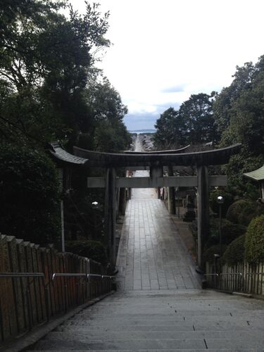 すばらしい眺めです 天命をほう奉じてかの地に渡らん 希(ねがわ)くば開運をた垂れ給え 神功皇后が渡韓のおりこの地に滞在され祈願されたという 海まで一直線に伸びた参道 その先が島に向かっている なんて美しい風景でしょう そして、この神社のもつ「陽」…