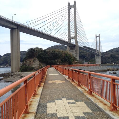 厳島神社と弁天島 佐賀県唐津市「加部島」を結ぶ「呼子大橋」の下に見える 「弁天島」は「弁天遊歩橋」で渡ることができます。 「呼子大橋」が緩やかな弧を描いているのは女島(弁天島の一つ)にある「弁天さん」の頭をまたがない様にとの配慮なのだそうです…